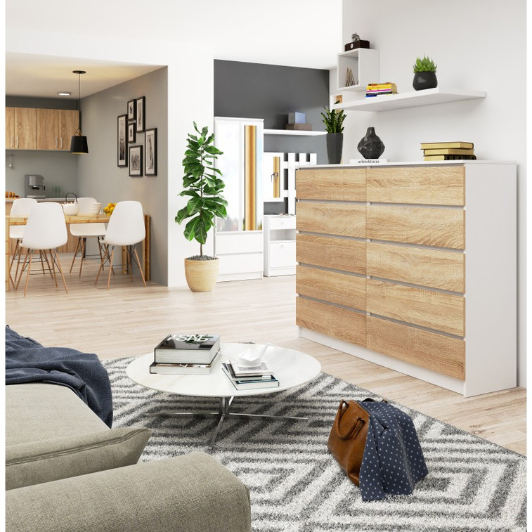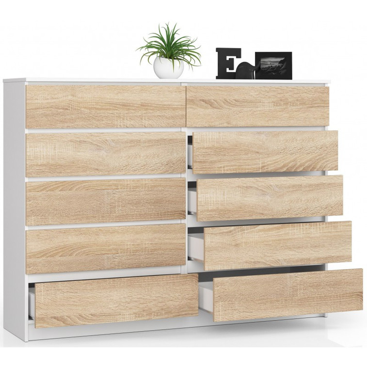 Jednoduchá a moderní komoda K160 10SZ. Je vyrobená z pevné laminované desky, která je odolná proti oděru a poškození. Univerzální vzhled splní očekávání každého, kdo ocení kombinaci jednoduchosti a elegance. Bezúchytková čela zásuvek zajišťují pohodlné používání.