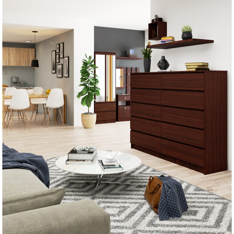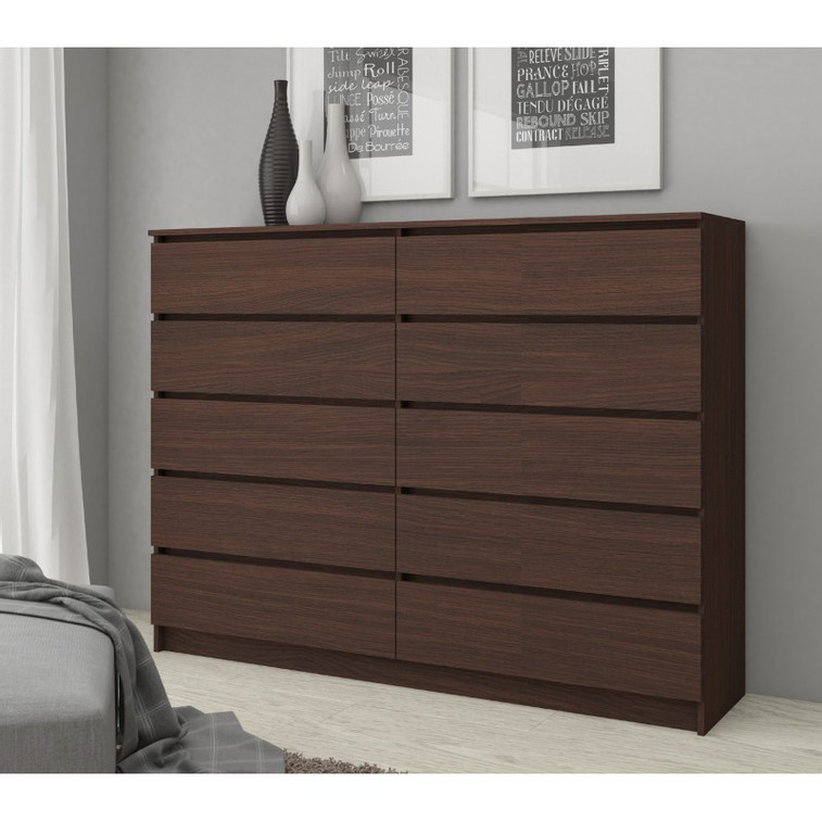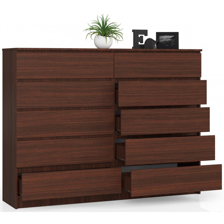 Jednoduchá a moderní komoda K160 10SZ. Je vyrobená z pevné laminované desky, která je odolná proti oděru a poškození. Univerzální vzhled splní očekávání každého, kdo ocení kombinaci jednoduchosti a elegance. Bezúchytková čela zásuvek zajišťují pohodlné používání.