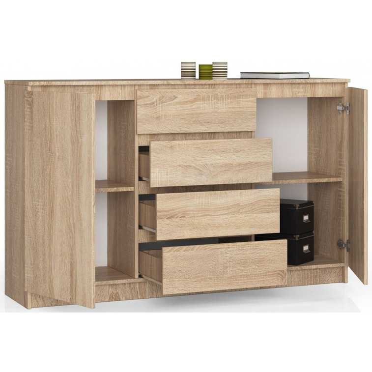 Jednoduchá a moderní komoda K160 2D4SZ. Je vyrobená z pevné laminované desky, která je odolná proti oděru a poškození. Univerzální vzhled splní očekávání každého, kdo ocení kombinaci jednoduchosti a elegance. Bezúchytková čela zásuvek zajišťují pohodlné používání.