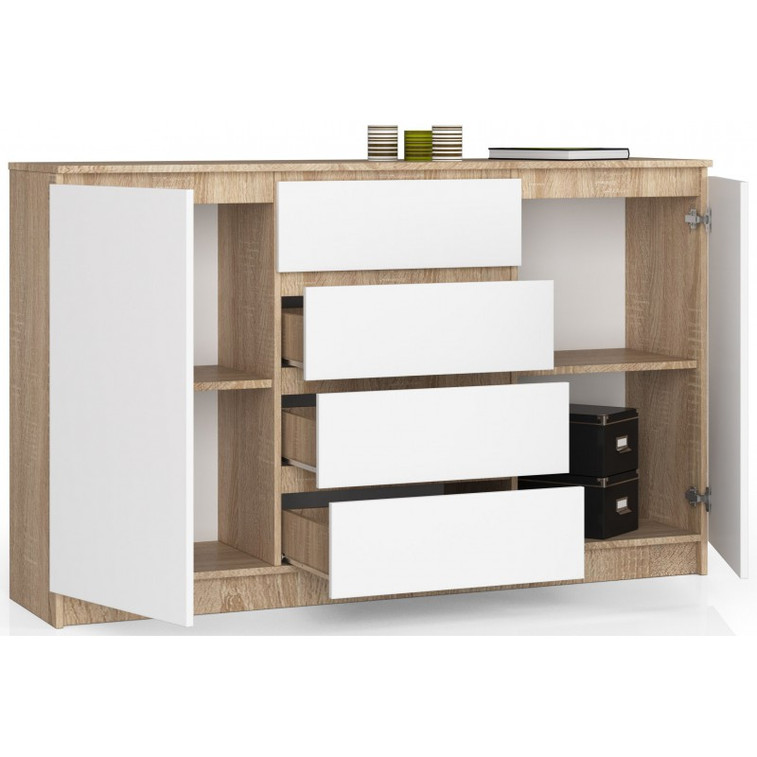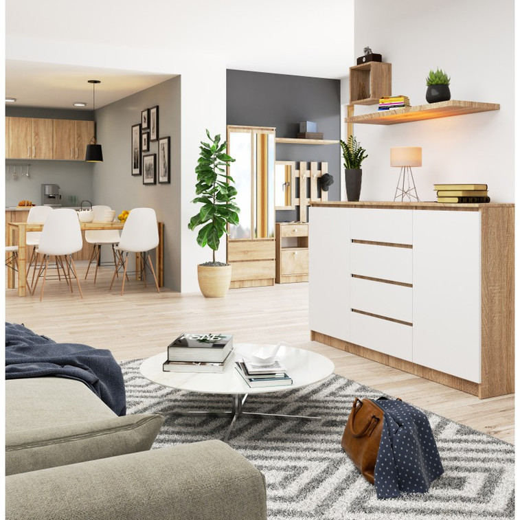 Jednoduchá a moderní komoda K160 2D4SZ. Je vyrobená z pevné laminované desky, která je odolná proti oděru a poškození. Univerzální vzhled splní očekávání každého, kdo ocení kombinaci jednoduchosti a elegance. Bezúchytková čela zásuvek zajišťují pohodlné používání.