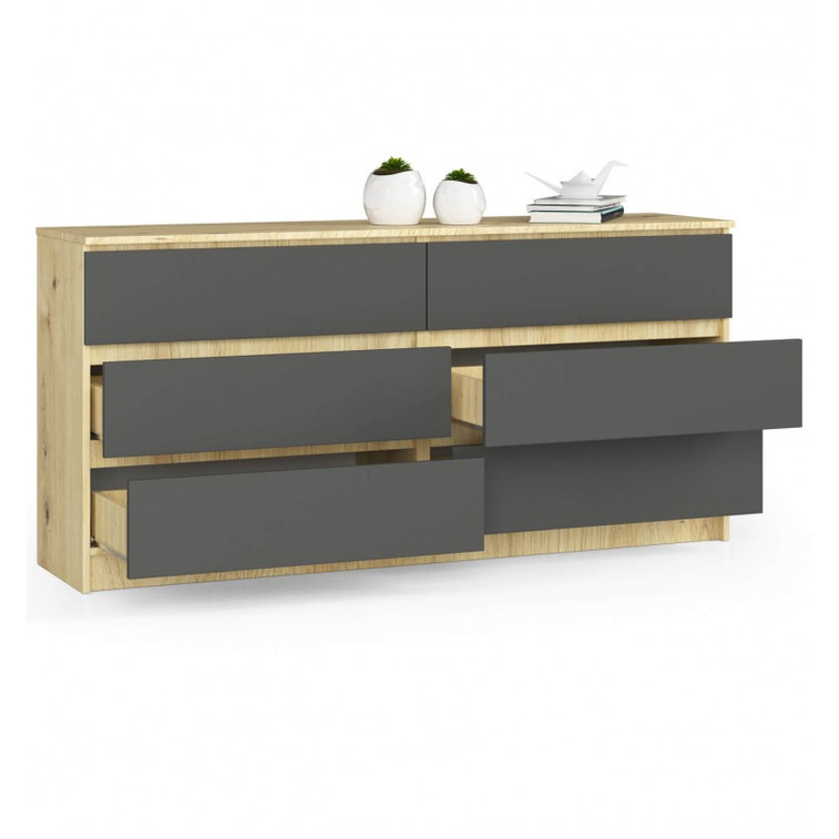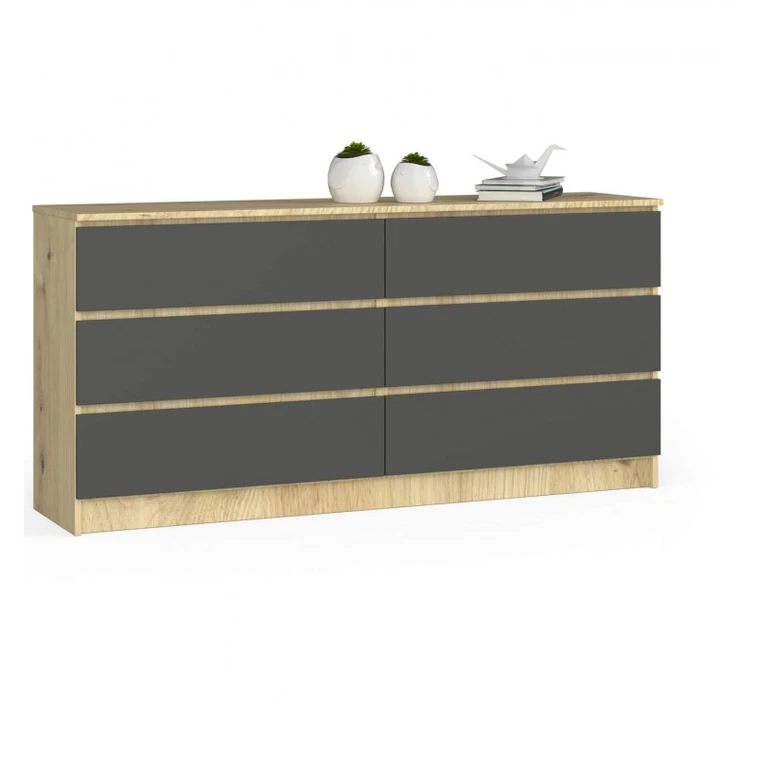 Jednoduchá a moderní komoda K160 6SZ. Je vyrobená z pevné laminované desky, která je odolná proti oděru a poškození. Univerzální vzhled splní očekávání každého, kdo ocení kombinaci jednoduchosti a elegance.