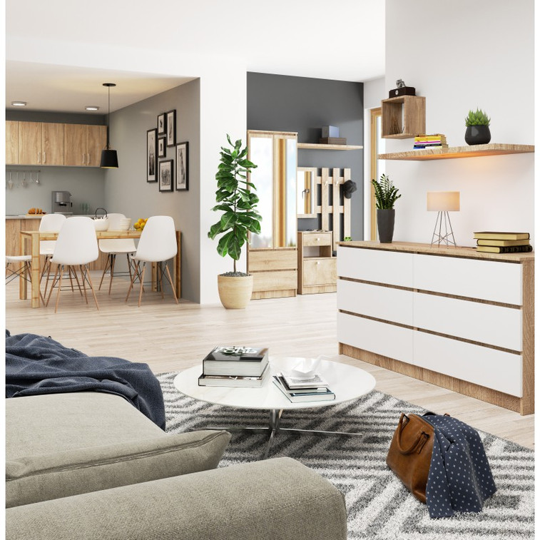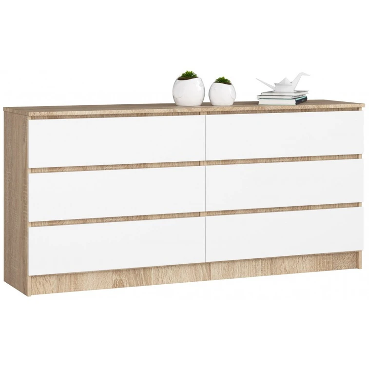 Jednoduchá a moderní komoda K160 6SZ. Je vyrobená z pevné laminované desky, která je odolná proti oděru a poškození. Univerzální vzhled splní očekávání každého, kdo ocení kombinaci jednoduchosti a elegance. Bezúchytková čela zásuvek zajišťují pohodlné používání.