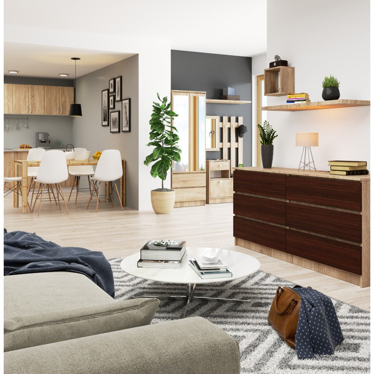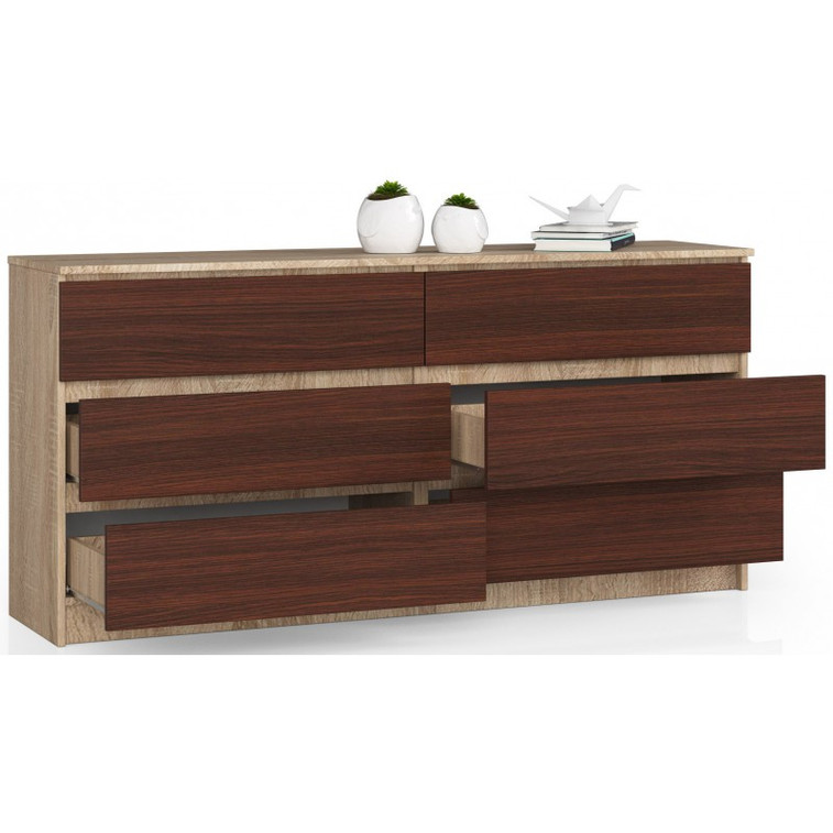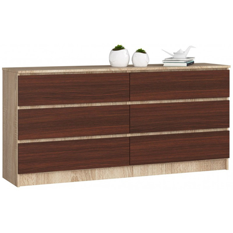 Jednoduchá a moderní komoda K160 6SZ. Je vyrobená z pevné laminované desky, která je odolná proti oděru a poškození. Univerzální vzhled splní očekávání každého, kdo ocení kombinaci jednoduchosti a elegance. Bezúchytková čela zásuvek zajišťují pohodlné používání.