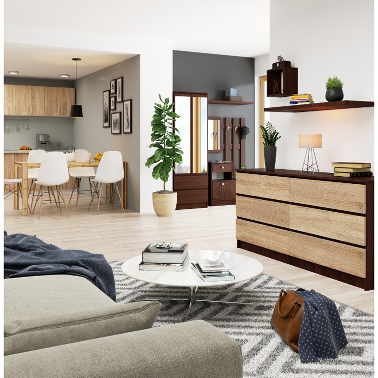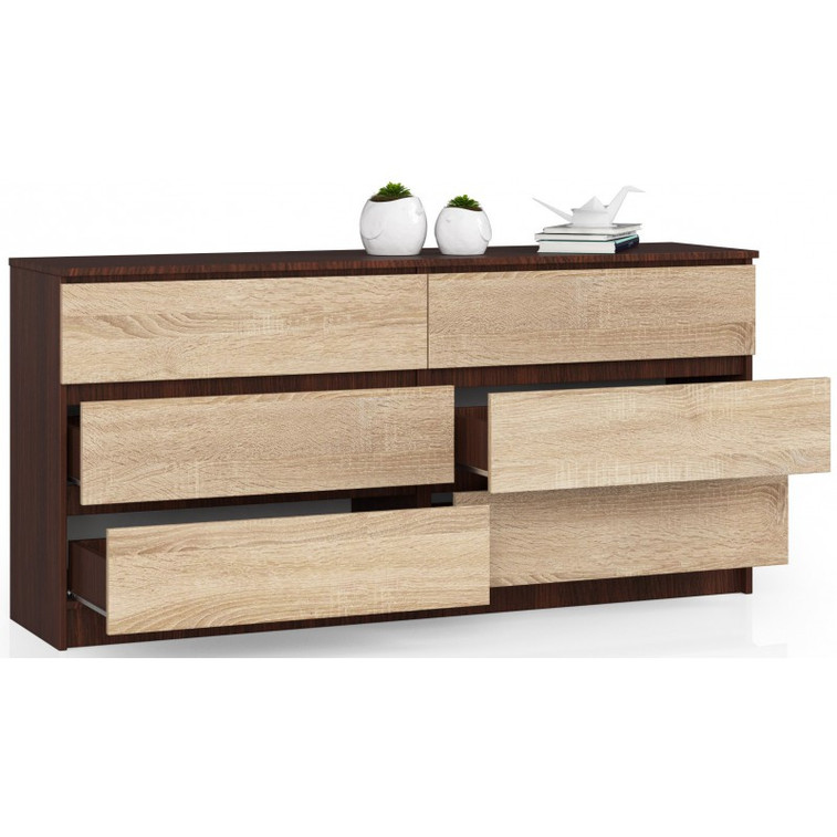Jednoduchá a moderní komoda K160 6SZ. Je vyrobená z pevné laminované desky, která je odolná proti oděru a poškození. Univerzální vzhled splní očekávání každého, kdo ocení kombinaci jednoduchosti a elegance. Bezúchytková čela zásuvek zajišťují pohodlné používání.