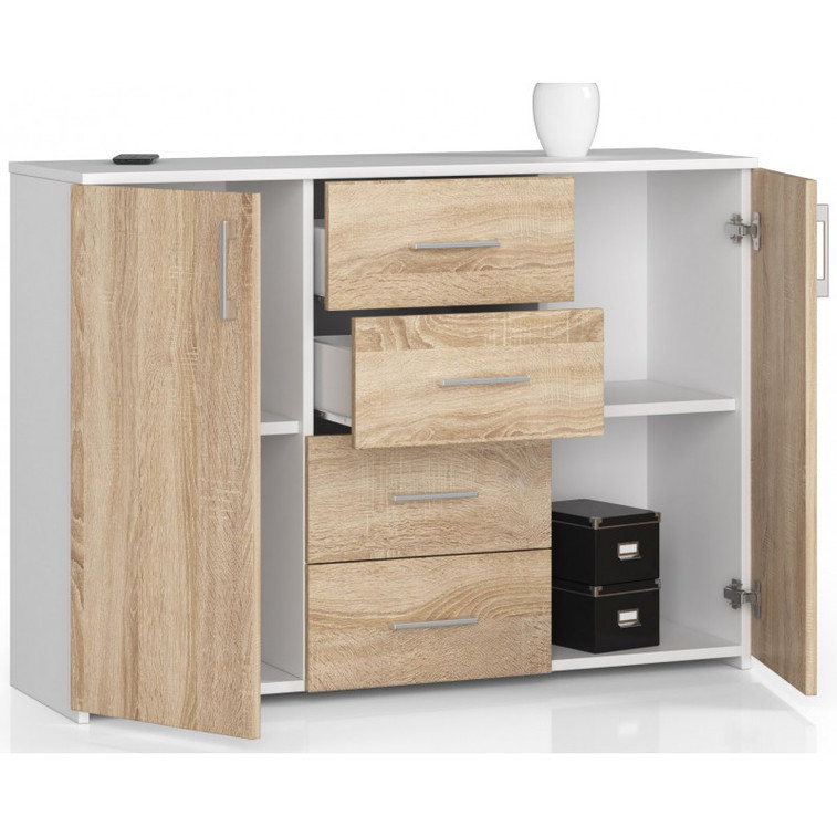 Jednoduchá a moderní komoda K45. Je vyrobená z pevné laminované desky, která je odolná proti oděru a poškození. Univerzální vzhled splní očekávání každého, kdo ocení kombinaci jednoduchosti a elegance.