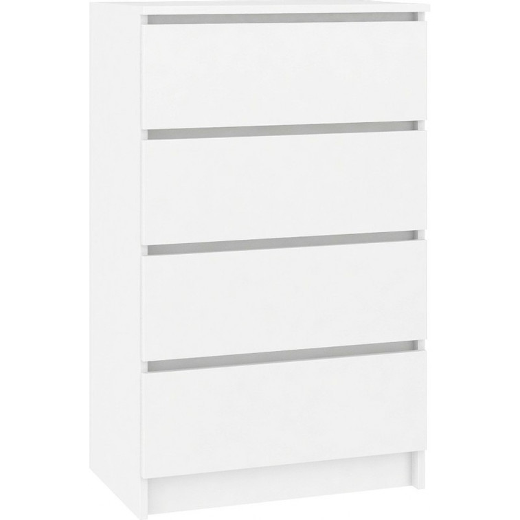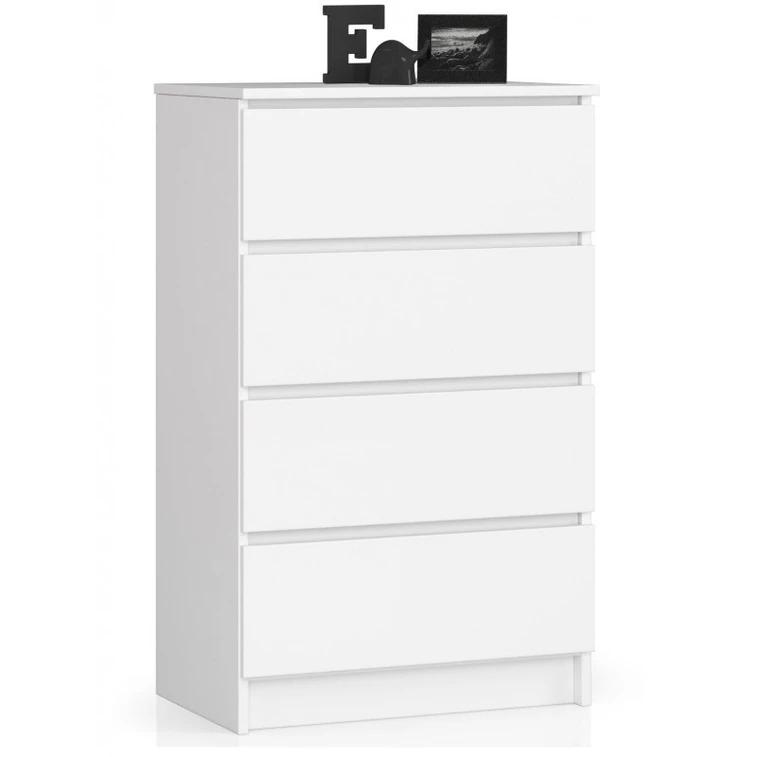 Jednoduchá a moderní komoda K60 4SZ. Je vyrobená z pevné laminované desky, která je odolná proti oděru a poškození. Univerzální vzhled splní očekávání každého, kdo ocení kombinaci jednoduchosti a elegance. Bezúchytková čela zásuvek zajišťují pohodlné používání.