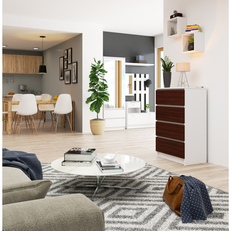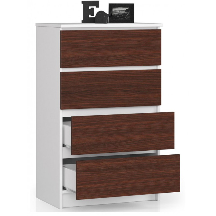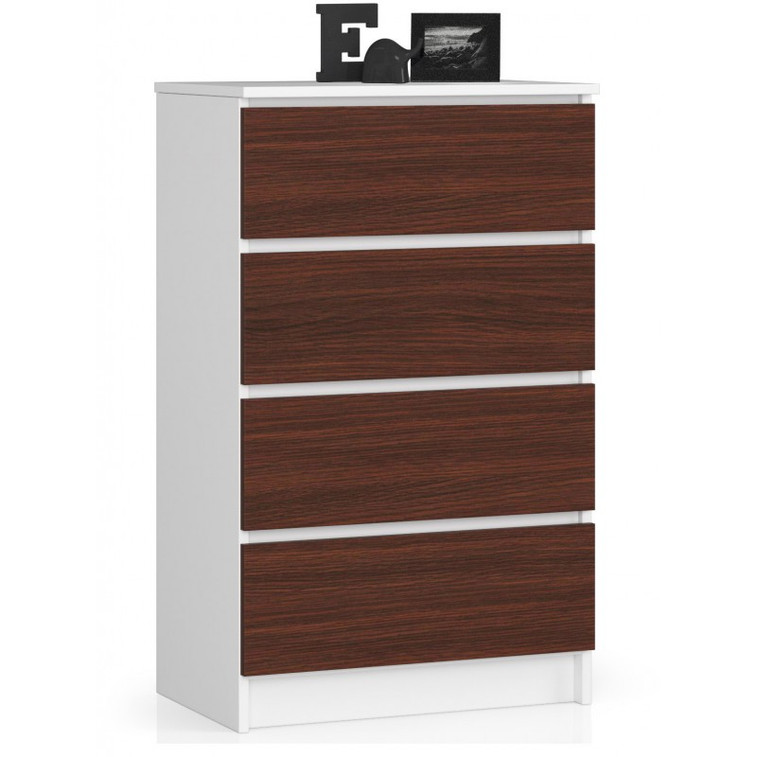 Jednoduchá a moderní komoda K60 4SZ. Je vyrobená z pevné laminované desky, která je odolná proti oděru a poškození. Univerzální vzhled splní očekávání každého, kdo ocení kombinaci jednoduchosti a elegance. Bezúchytková čela zásuvek zajišťují pohodlné používání.