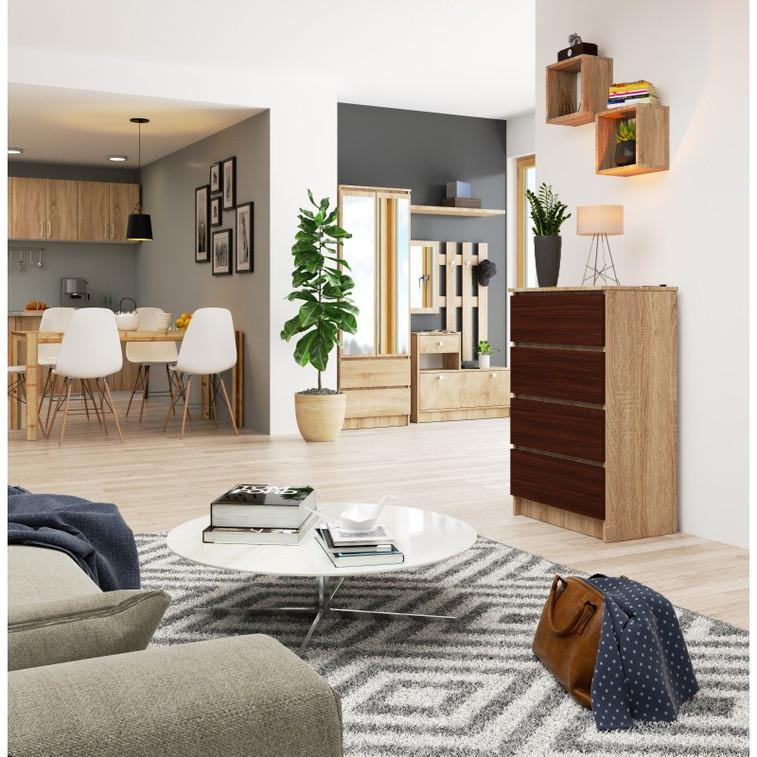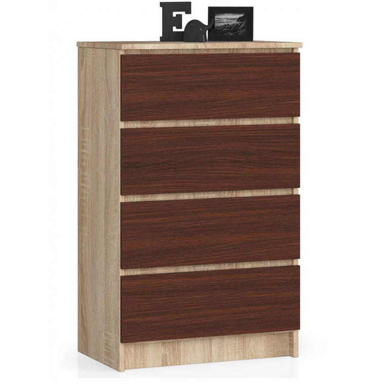 Jednoduchá a moderní komoda K60 4SZ. Je vyrobená z pevné laminované desky, která je odolná proti oděru a poškození. Univerzální vzhled splní očekávání každého, kdo ocení kombinaci jednoduchosti a elegance. Bezúchytková čela zásuvek zajišťují pohodlné používání.