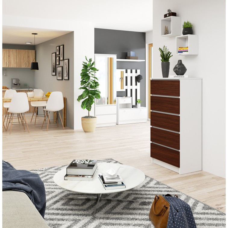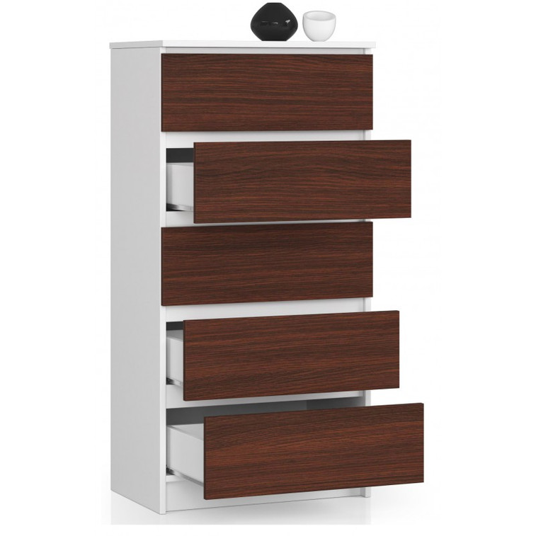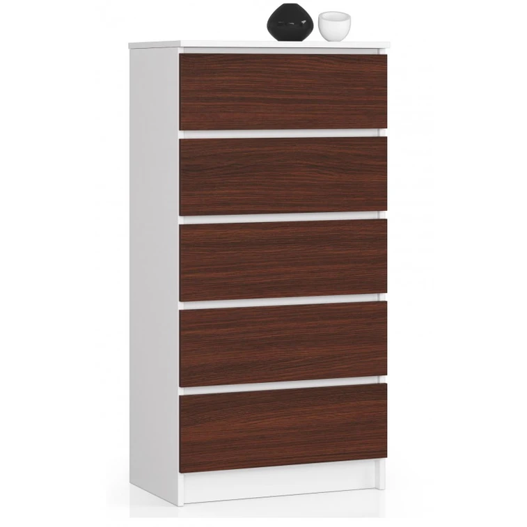 Jednoduchá a moderní komoda K60 5SZ. Je vyrobená z pevné laminované desky, která je odolná proti oděru a poškození. Univerzální vzhled splní očekávání každého, kdo ocení kombinaci jednoduchosti a elegance. Bezúchytková čela zásuvek zajišťují pohodlné používání.