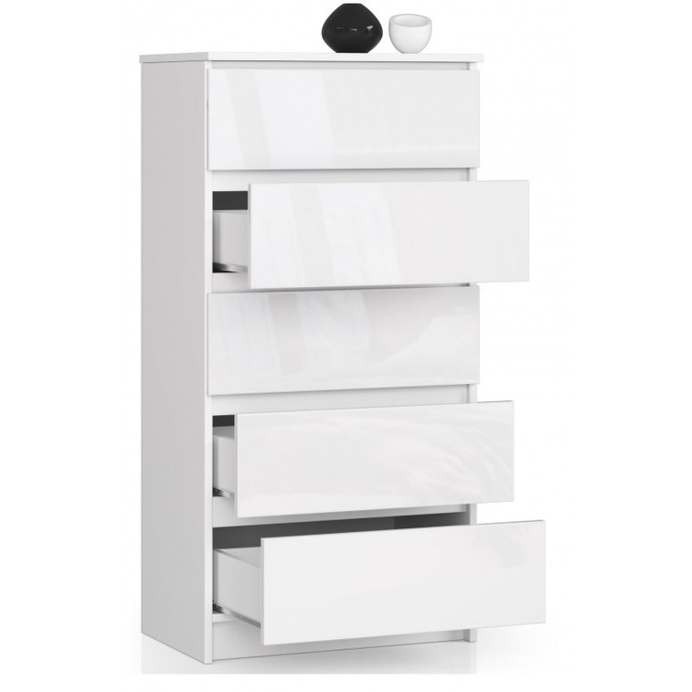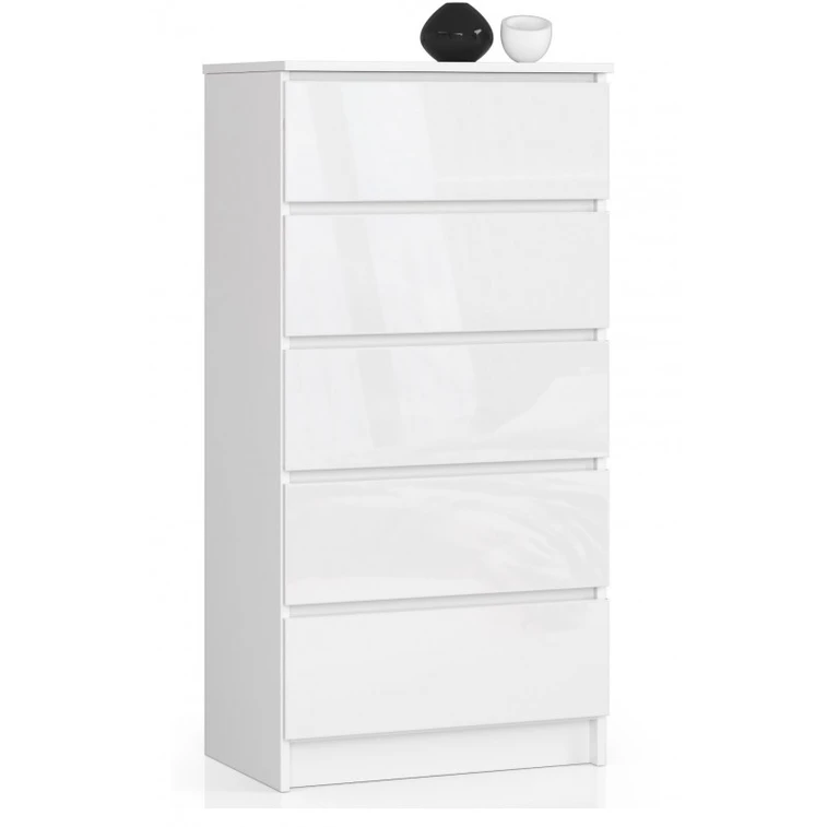Jednoduchá a moderní komoda K60 5SZ. Je vyrobená z pevné laminované desky, která je odolná proti oděru a poškození. Univerzální vzhled splní očekávání každého, kdo ocení kombinaci jednoduchosti a elegance. Bezúchytková čela zásuvek zajišťují pohodlné používání.