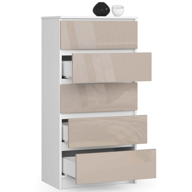 Jednoduchá a moderní komoda K60 5SZ. Je vyrobená z pevné laminované desky, která je odolná proti oděru a poškození. Univerzální vzhled splní očekávání každého, kdo ocení kombinaci jednoduchosti a elegance. Bezúchytková čela zásuvek zajišťují pohodlné používání.