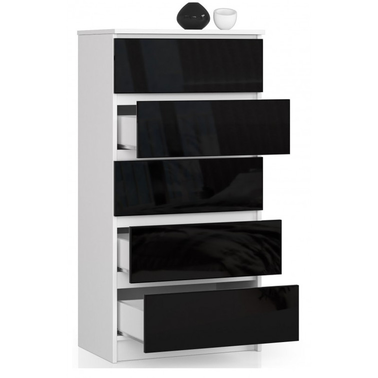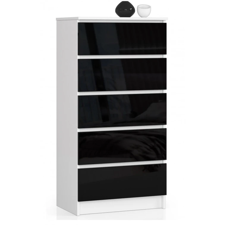 Jednoduchá a moderní komoda K60 5SZ. Je vyrobená z pevné laminované desky, která je odolná proti oděru a poškození. Univerzální vzhled splní očekávání každého, kdo ocení kombinaci jednoduchosti a elegance. Bezúchytková čela zásuvek zajišťují pohodlné používání.