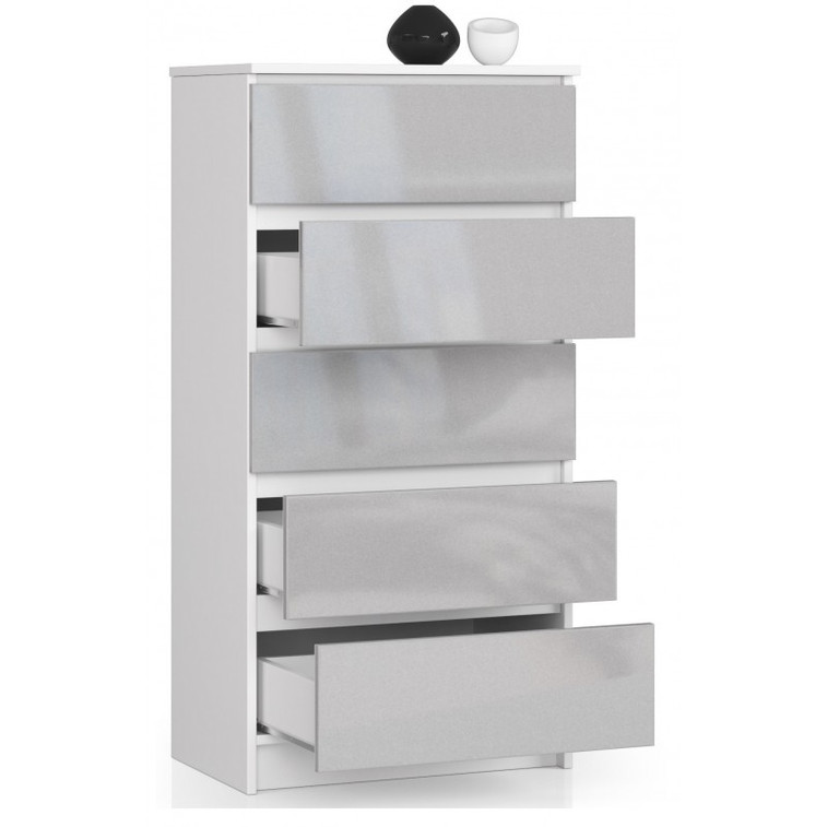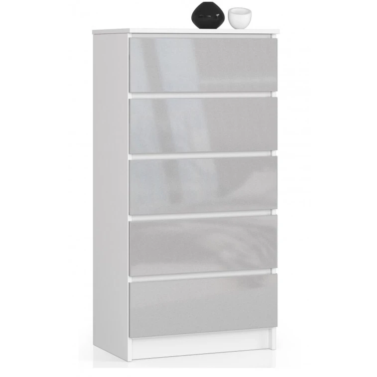 Jednoduchá a moderní komoda K60 5SZ. Je vyrobená z pevné laminované desky, která je odolná proti oděru a poškození. Univerzální vzhled splní očekávání každého, kdo ocení kombinaci jednoduchosti a elegance. Bezúchytková čela zásuvek zajišťují pohodlné používání.