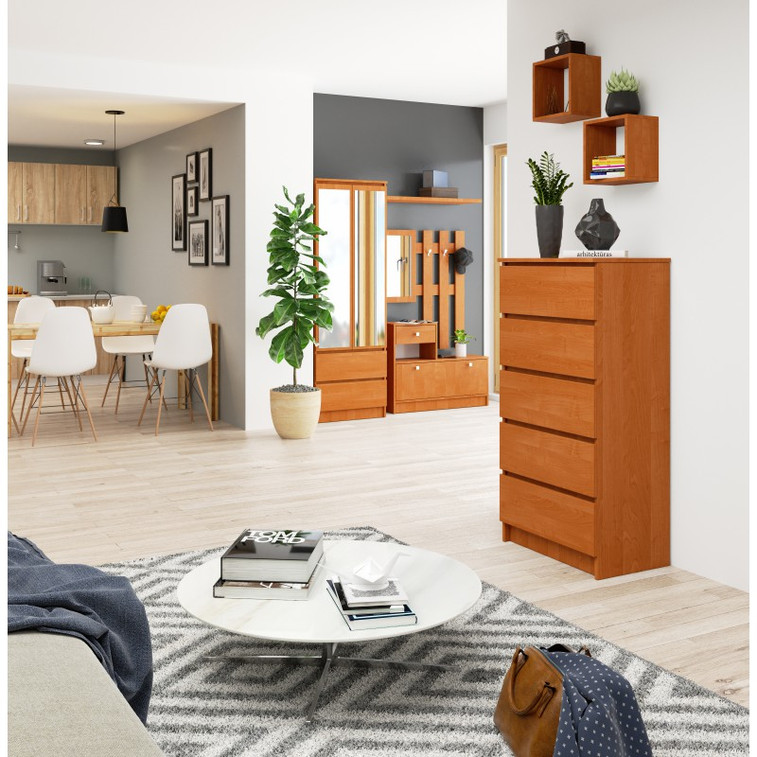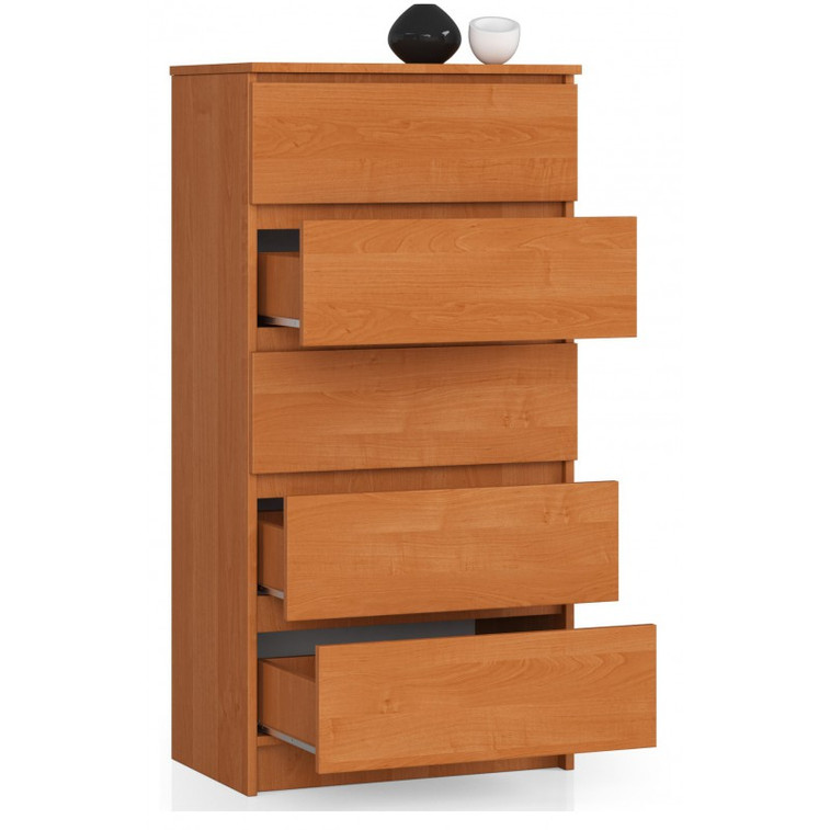 Jednoduchá a moderní komoda K60 5SZ. Je vyrobená z pevné laminované desky, která je odolná proti oděru a poškození. Univerzální vzhled splní očekávání každého, kdo ocení kombinaci jednoduchosti a elegance. Bezúchytková čela zásuvek zajišťují pohodlné používání.