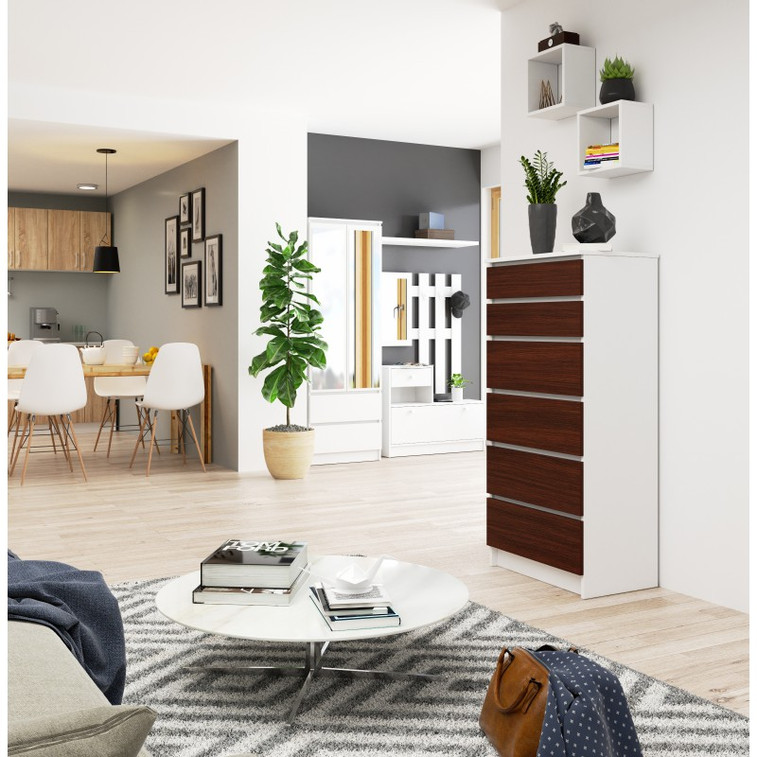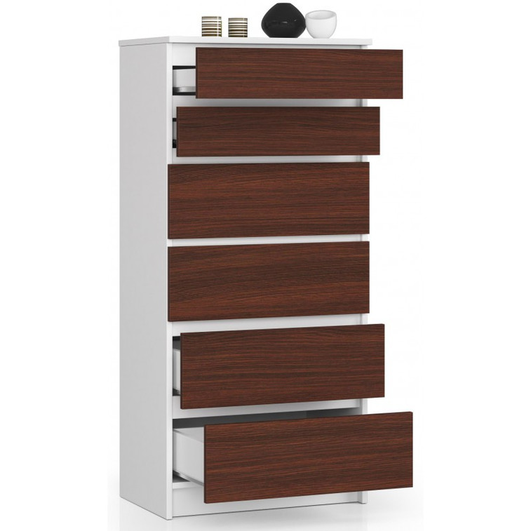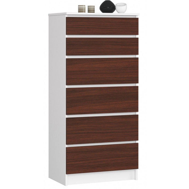 Jednoduchá a moderní komoda K60 6SZ. Je vyrobená z pevné laminované desky, která je odolná proti oděru a poškození. Univerzální vzhled splní očekávání každého, kdo ocení kombinaci jednoduchosti a elegance. Bezúchytková čela zásuvek zajišťují pohodlné používání.