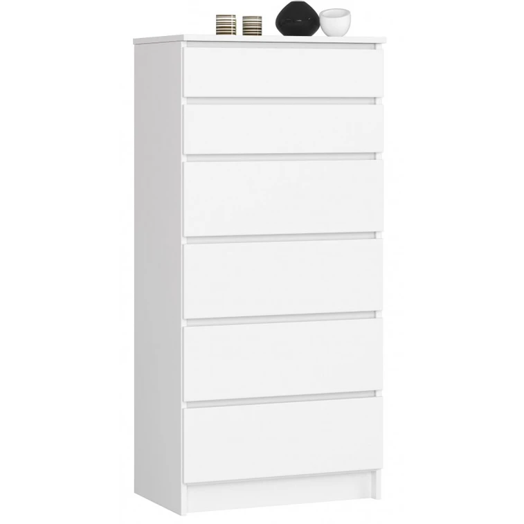 Jednoduchá a moderní komoda K60 6SZ. Je vyrobená z pevné laminované desky, která je odolná proti oděru a poškození. Univerzální vzhled splní očekávání každého, kdo ocení kombinaci jednoduchosti a elegance. Bezúchytková čela zásuvek zajišťují pohodlné používání.