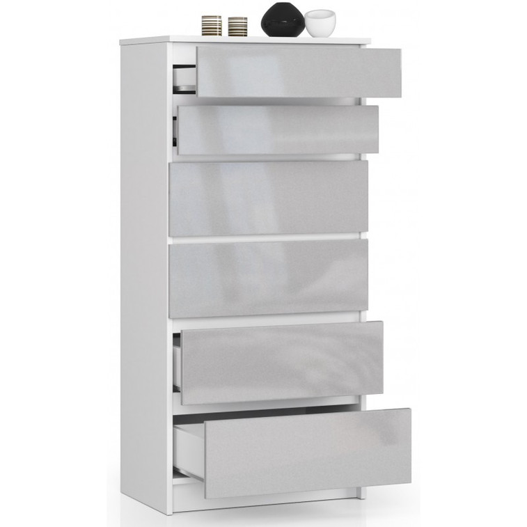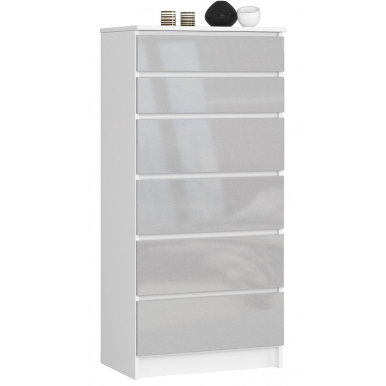Jednoduchá a moderní komoda K60 6SZ. Je vyrobená z pevné laminované desky, která je odolná proti oděru a poškození. Univerzální vzhled splní očekávání každého, kdo ocení kombinaci jednoduchosti a elegance. Bezúchytková čela zásuvek zajišťují pohodlné používání.
