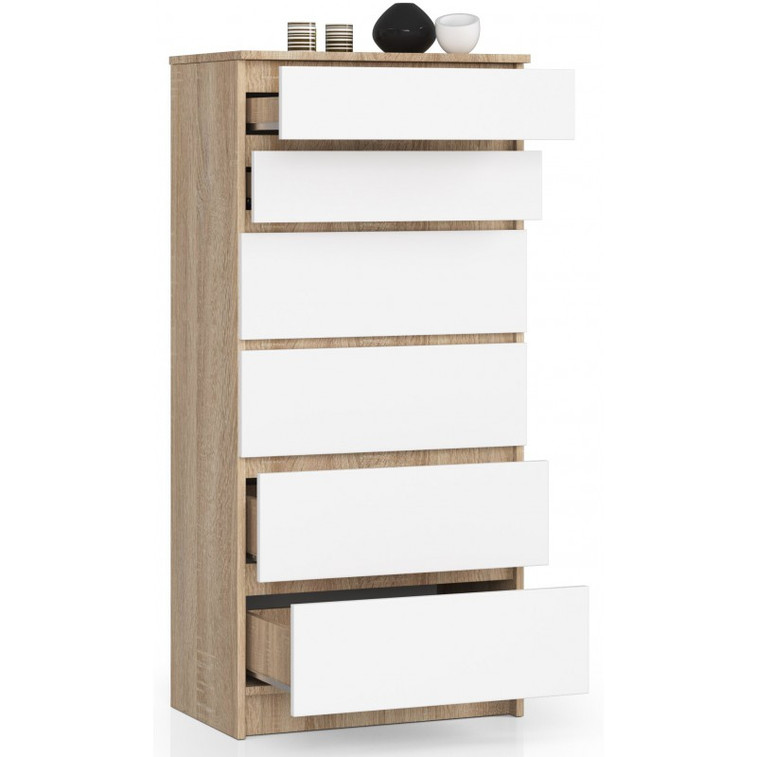 Jednoduchá a moderní komoda K60 6SZ. Je vyrobená z pevné laminované desky, která je odolná proti oděru a poškození. Univerzální vzhled splní očekávání každého, kdo ocení kombinaci jednoduchosti a elegance. Bezúchytková čela zásuvek zajišťují pohodlné používání.