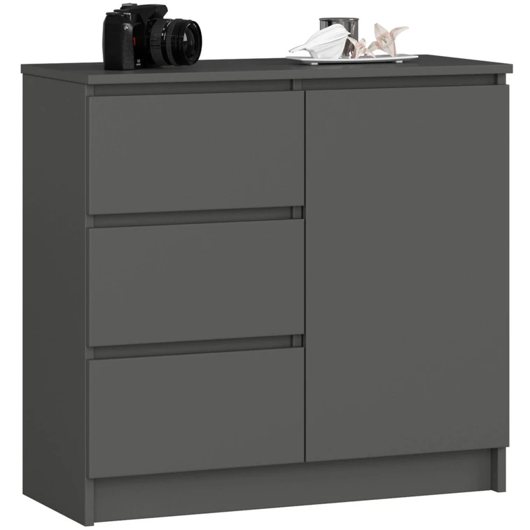Jednoduchá a moderní komoda. Je vyrobená z pevné laminované desky, která je odolná proti oděru a poškození. Univerzální vzhled splní očekávání každého, kdo ocení kombinaci jednoduchosti a elegance. Bezúchytková čela zásuvek a dvířek zajišťují pohodlné používání.