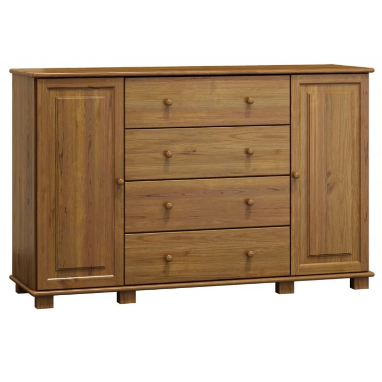 Komoda KN36 118x47 cm. Komoda je vyrobena z borovicového dřeva, které zaručuje odolnou konstrukci. Ergonomický tvar umožňuje efektivně udržovat v uložených věcech pořádek.  Zásuvky se vysouvají s lehkostí a zvyšují tak komfort používání. Minimalistický design komody skvěle zapadne do klasických i moderních aranžmá. Nábytek z přírodního materiálu vnese do místnosti vkusný dekorativní prvek.