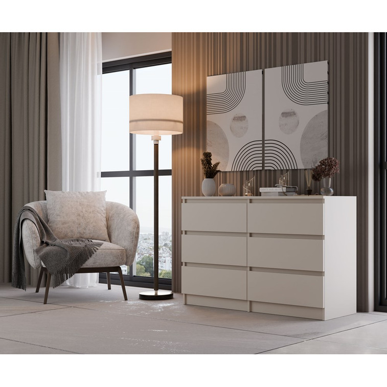 Jednoduchá a moderní komoda. Je vyrobená z pevné laminované desky, která je odolná proti oděru a poškození. Univerzální vzhled splní očekávání každého, kdo ocení kombinaci jednoduchosti a elegance. Bezúchytková čela zásuvek zajišťují pohodlné používání.