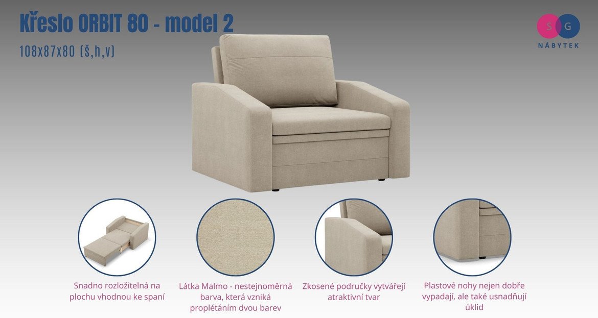 Křeslo ORBIT 80 je moderní a stylový kus nábytku, který byl navržen s ohledem na lidi kteří oceňují pohodlí a funkčnost. Je vyrobeno z pevných, vysoce kvalitních materiálů. Nohy jsou vyrobeny z plastu. Součástí křesla je úložný prostor.