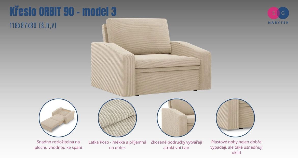 Křeslo ORBIT 80 je moderní a stylový kus nábytku, který byl navržen s ohledem na lidi kteří oceňují pohodlí a funkčnost. Je vyrobeno z pevných, vysoce kvalitních materiálů. Nohy jsou vyrobeny z plastu. Součástí křesla je úložný prostor.