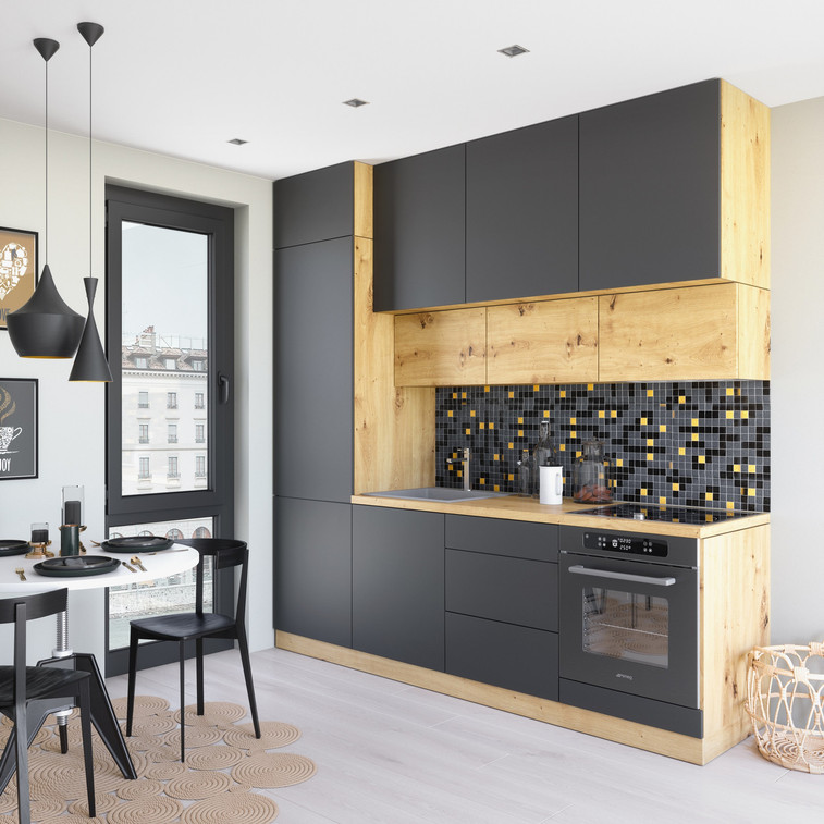 Moderní kuchyňská sestava VINTO 2,4 m v odstínu dub artisan/šedá. Hotová sestava, která vám pomůže zařídit malý kuchyňský prostor.