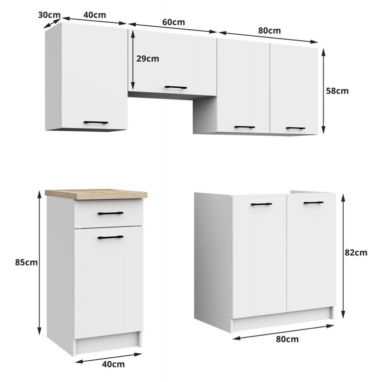 Jednoduchý kuchyňský nábytek Olivia je nabídka určená lidem, kteří jsou ve fázi zařizování své malé kuchyně. Systémová řešení jsou mimořádně funkční a dobře fungují v malých místnostech. Představujeme vám systém kuchyňských skříněk s deskou, která kombinuje módní odstín dub sonoma a klasicky krásnou, nesmrtelnou bílou a beton.