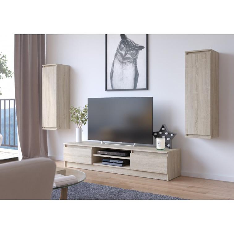 Nástěnná sestava CLP + RTV. Představujeme vám sadu nábytku, která se skládá ze skříňky RTV a dvou závěsných skříní. Tato sestava může být funkčním vybavením obývacího pokoje, pracovny, nebo pokoje pro mládež. Nábytek je vybaven praktickými policemi pro elektroniku, s bočními úložnými prostory s výklopnými dvířky, do kterých můžete ukládat DVD, počítačové příslušenství, nebo jiné drobnosti. Nábytek zabírá málo místa, takže je vhodný nejen pro velký obývací pokoj ale také pro malé místnosti.
