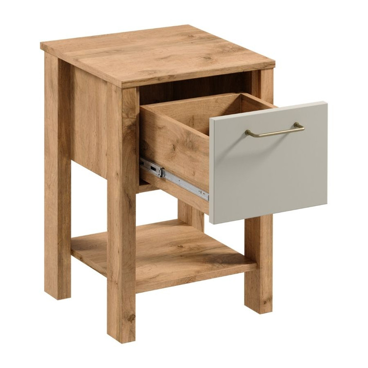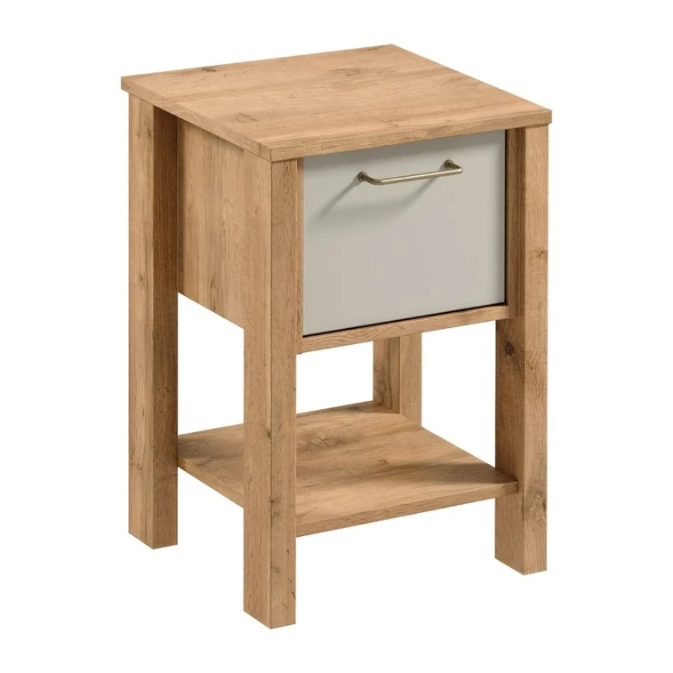 Noční stolek je krásným doplňkem do ložnice. Součástí je praktická zásuvka na drobnosti nebo šikovná police na knihy. Matně zlatá rukojeť dodává eleganci. Přírodní barvy teplého dekoru Dub Wotan jako základu nábytku v kombinaci s jednobarevnou béžovou nebo zelenou na výběr dělají kolekci přirozeně krásnou.
