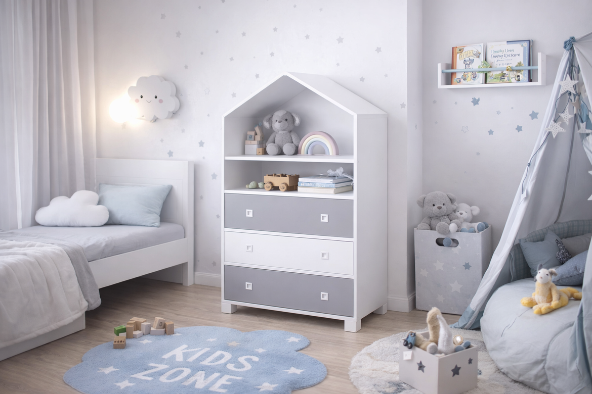 Úložné řešení je v dětském pokoji klíčové. Komody různých velikostí pomáhají udržet pořádek — od oblečení až po hračky. Praktické zásuvky i rozdílné rozměry usnadní optimalizaci prostoru a přehlednost pokoje.