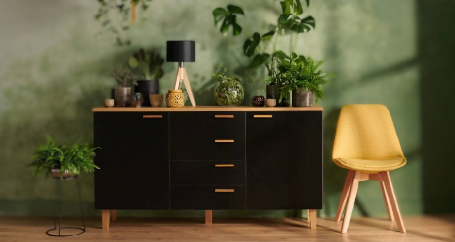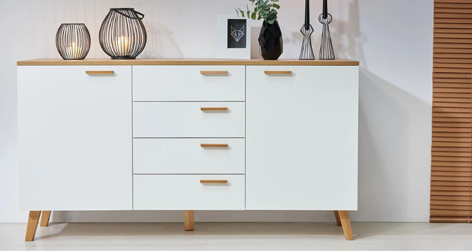 V jídelně můžete komodu umístit vedle vyšší vitríny, vedle příručního stolku, také pod okno a podobně. Díky různým velikostem prostor opticky a pocitově nezahltí, a přitom získáte dostatek úložného prostoru.