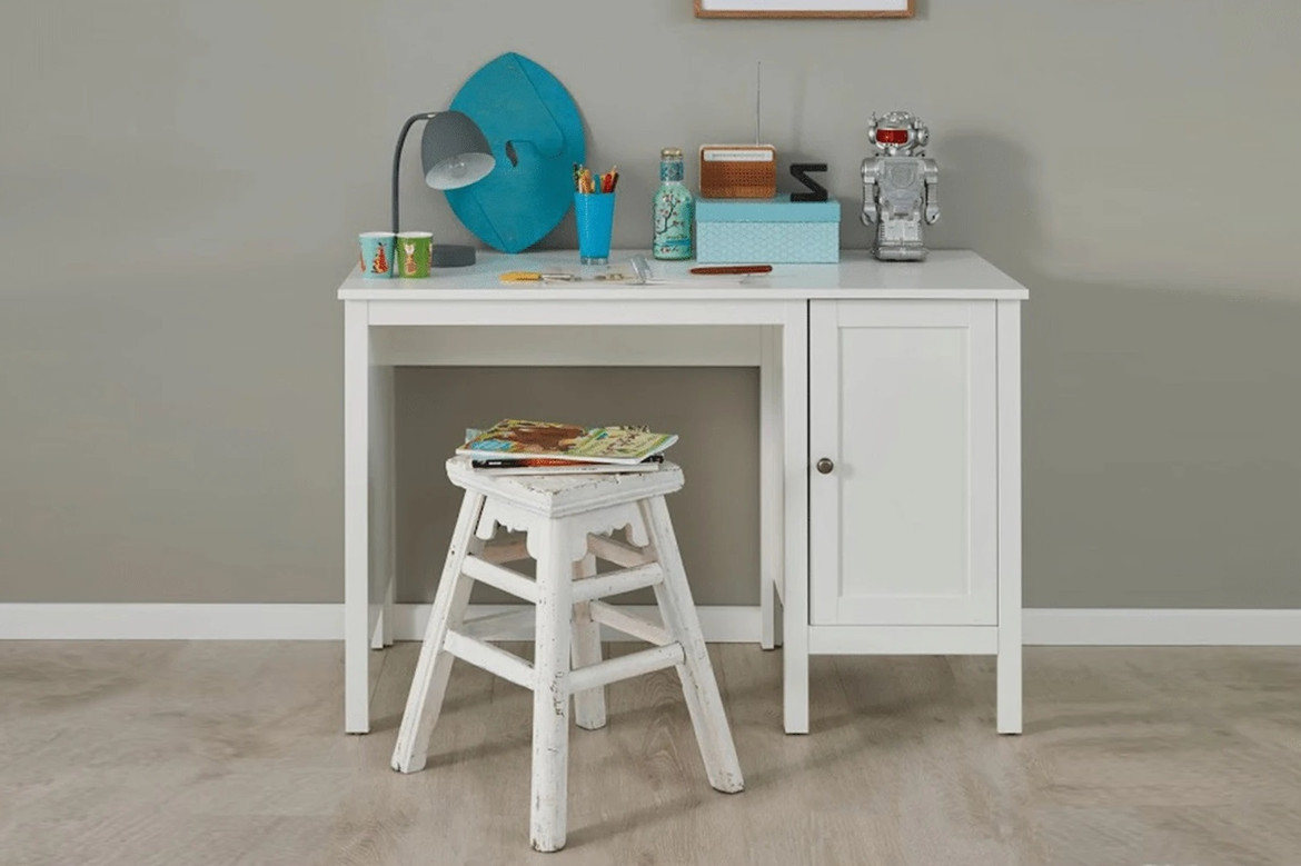 Psací stůl do dětského pokojePro děti vybíráme často dětský nábytek barevný a dispozičně řešený tak, aby jim sloužil mnoho let po čas studia. Dětské psací stoly mohou být bílé doplněné o barevné prvky. Stejně tak mohou být doplněny např. o regál, který tvoří polovinu stolku – jeho nohou. V praxi to vypadá tak, že na jedné straně stolu je boční deska představující nohy a na druhé je regál, jehož většinou třetí police od spodu je protažená a tvoří pracovní desku. Šikovné, hezké a praktické řešení, které lze použít i do pracovny.