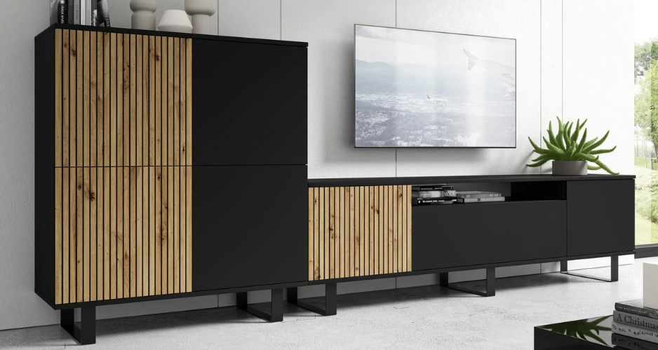 Také v obýváku se setkáváme s hezkou a praktickou sestavou nábytku. Obývací stěny zpravidla obsahují TV stolek, komodu, skříňku k pověšení či postavení na zem a také poličku.
