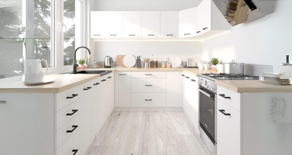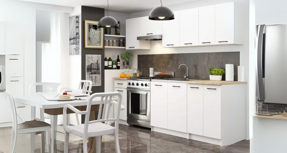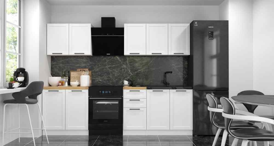Moderní a elegantní zároveň jsou bílé kuchyňské linky, které si můžete koupit v délkách 180 cm, 240 cm nebo 3m. Jde o rovné sety, delší 3m je rohový, takže pokud nemáte prostor dostatečné délky u zdi, bude rohový typ ideální pro vás. Bílé skříňky jsou doplněny o pracovní desku v imitaci masivu, úchyty jsou nenápadné a vkusné tak, aby nenarušovaly celkový ráz kuchyně. Výhodou těchto setů je, že se výborně kombinují i tam, kde chtějí majitelé nemovitosti zachovat část kuchyně, např. skříň sloužící coby spižírna, jídelní stůl se židlemi nebo třeba podlahu, která má jakoukoli barvu.