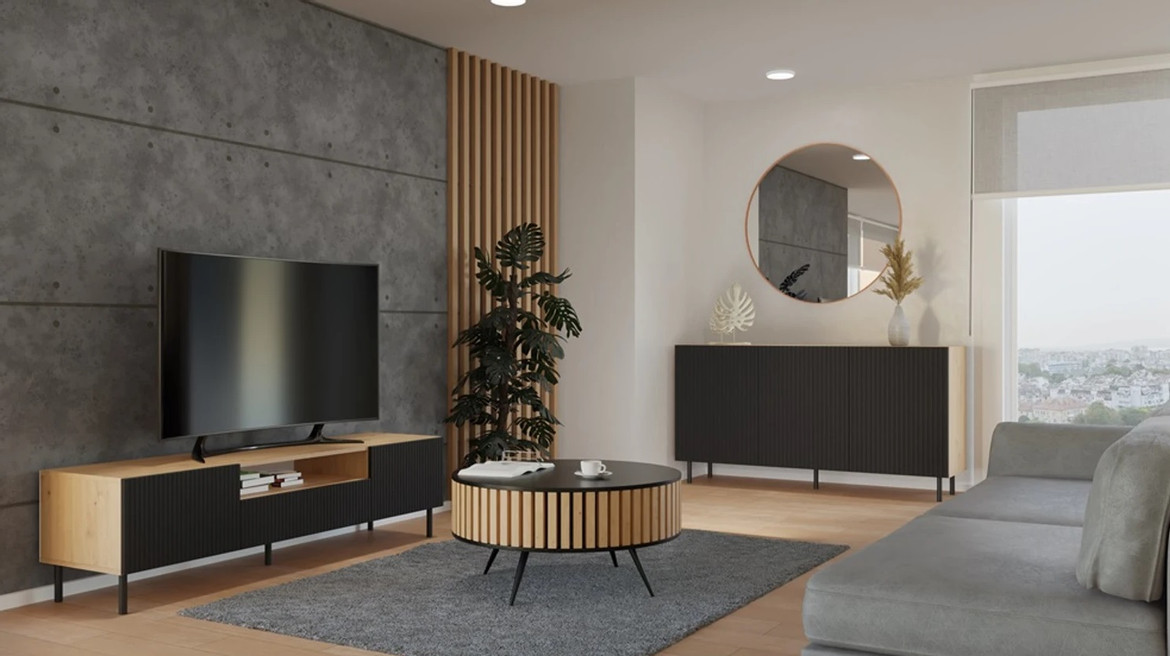 Velmi trendy jsoukomody, které jsou tvořeny korpusem v jiné barvě, než čela šuplíků nebo dvířka. Krásně spolu vypadá např. kombinace dubu artisan, tedy přírodniny a antracitu. Dřevo na tmavém podkladě vynikne a zdůrazněny jsou i suky ve dřevě a jeho struktura.