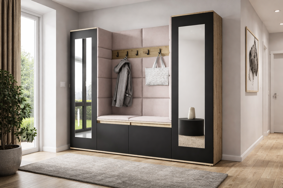 Moderní modely předsíňových stěn kombinují věšáky, zrcadla, poličky i uzavřené skříňky. Díky tomu můžete sladit praktičnost s estetickým vzhledem.