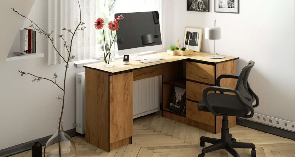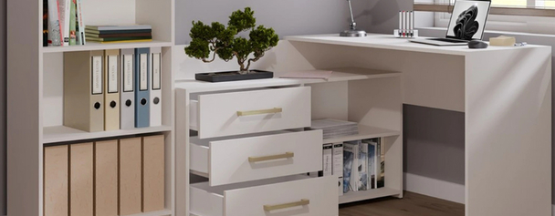 Pro své dispoziční řešení je velmi oblíbený např. počítačový stůl s pracovní deskou do písmene L pod níž se ukrývá na jedné straně skříňka se šuplíky a v rohu pak volně přístupné police. Druhá část stolu je určena pro umístění PC, takže pod ní úložné prosty chybí, čímž vzniká místo pro sedící osobu. Máte-li více prostoru, zvolit můžete o něco delší počítačový stůl, kde je ještě vedle sedící osoby skříňka s dvířky, tedy úložné prostory navíc.