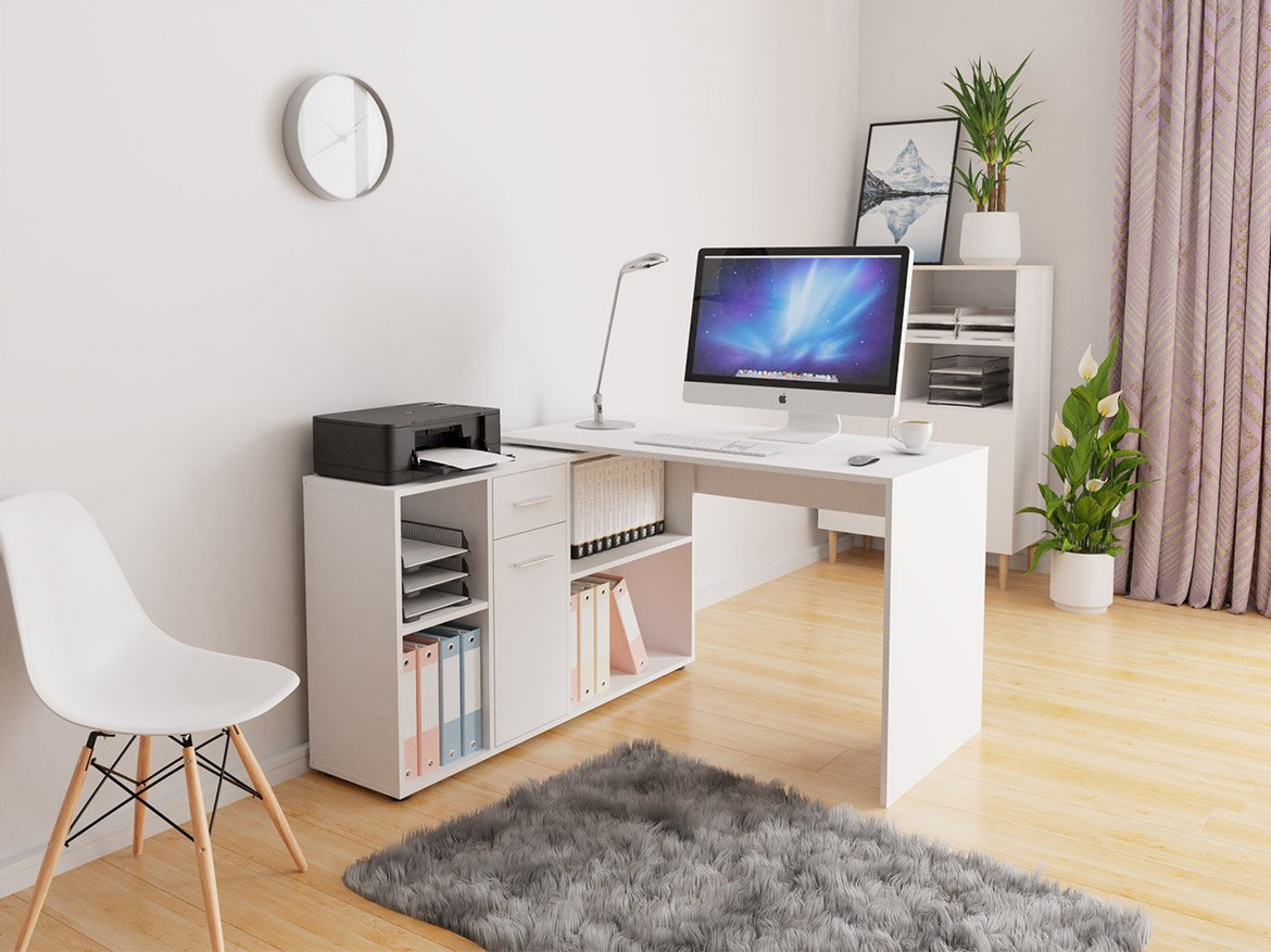 Věděli jste, že může být součástí stolu i regál? Jednoduše tvoří jeho boční část, má police a je takovým 2v1. Stejně tak ale může stůl tvořit i skříňka na jedné ze stran pod hlavní deskou a praktické šuplíky.