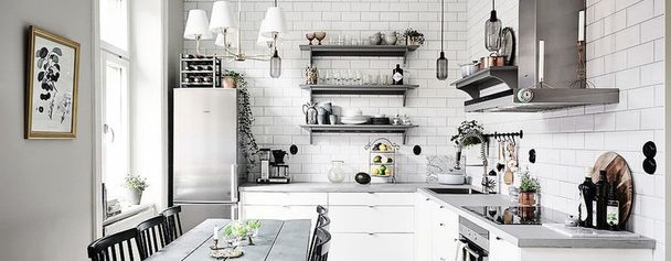 Co se týče kuchyňské linky, trendy jsou kuchyně, které tvoří bílé kuchyňské skříňky dolů nebo nahoře a v imitaci dřeva naopak (dolů nebo nahoře).