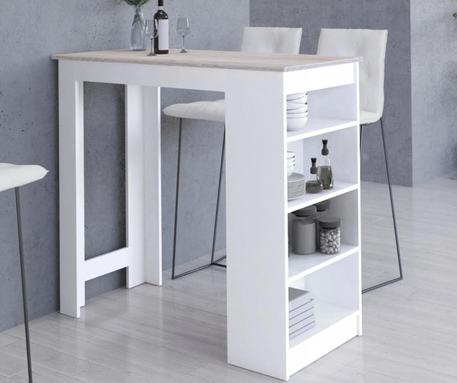 Velmi praktické jsou barové stoly, které mohou stát bokem nebo čelem přiražené ke stěně. Když jsou přiražené bokem, mohou vytvářet optický předěl mezi kuchyní a obývací částí. Když jsou přiražené ke zdi čelem, zaberou minimum místa, a přitom se pár žijící v 1kk nají společně a pohodlně.