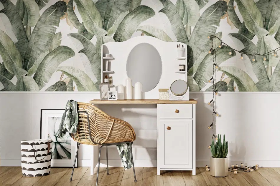 Pro milovníky venkovského stylu a rustikálního vzhledu jsou k dispozici toaletní stolky s přírodními, dřevěnými prvky a vintage detaily. Tyto stolky často mají hrubé a nepravidelné povrchy, které připomínají přírodní dřevo. Značky a stopy na dřevě dodávají stolu autentičnost a charakter. Můžete si vybrat stůl s integrovaným zrcadlem nebo umístit samostatné zrcadlo nad stolem. Uložení v přírodním stylu, jako jsou koše, škatulky nebo závěsné kbelíky, vytváří rustikální atmosféru.