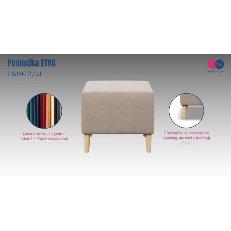 Kvalitní čalouněná podnožka ETNA - Kronos 50x50 cm je vyrobena z pevných, vysoce kvalitních materiálů. Nohy jsou vyrobeny ze dřeva.