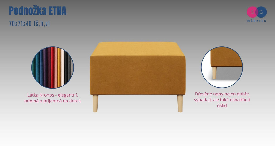 Kvalitní čalouněná podnožka Podnožka ETNA - Kronos 70x70 cm je vyrobena z pevných, vysoce kvalitních materiálů. Nohy jsou vyrobeny ze dřeva.