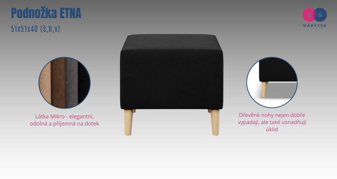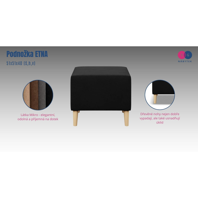 Kvalitní čalouněná podnožka ETNA - Mikro 50x50 cm je vyrobena z pevných, vysoce kvalitních materiálů. Nohy jsou vyrobeny ze dřeva.