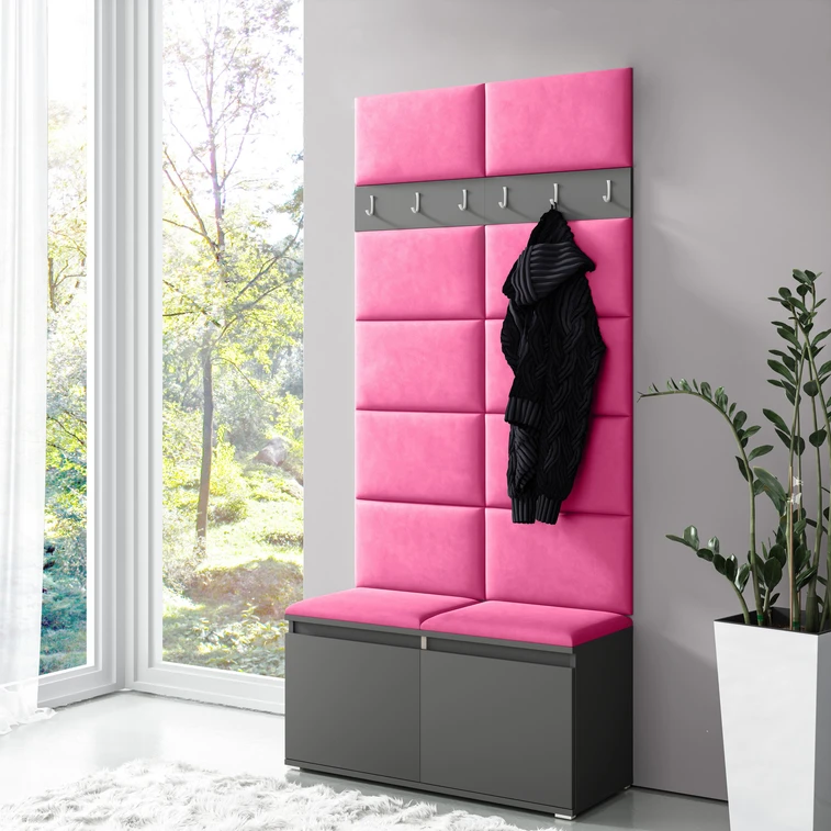 Je to moderní a praktický prvek do vstupních prostor vašeho domu. Předsíňová stěna obsahuje dvanáct čalouněných panelů, které se montují přímo na stěnu za pomoci lepidla. Potah botníku je tkanina TRINITY, která je měkká a příjemná na dotek. Jedná se o velurovou tkaninu. Předsíňová stěna se skládá z několika částí.