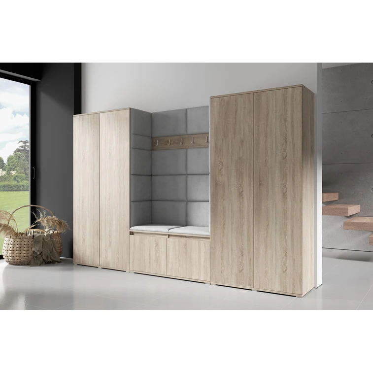 Předsíňová stěna AMI 10, je moderní a praktický prvek do vstupních prostor vašeho domu. Předsíňová stěna obsahuje dvacet čalouněných panelů, které se montují přímo na stěnu za pomoci lepidla. Potah botníku je tkanina TRINITY, která je měkká a příjemná na dotek. Jedná se o velurovou tkaninu. Předsíňová stěna se skládá z několika částí.