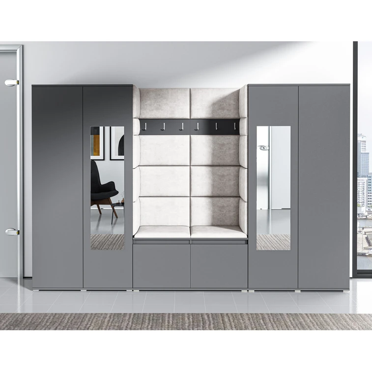 Předsíňová stěna AMI 10, je moderní a praktický prvek do vstupních prostor vašeho domu. Předsíňová stěna obsahuje dvacet čalouněných panelů, které se montují přímo na stěnu za pomoci lepidla. Potah botníku je tkanina TRINITY, která je měkká a příjemná na dotek. Jedná se o velurovou tkaninu. Předsíňová stěna se skládá z několika částí.