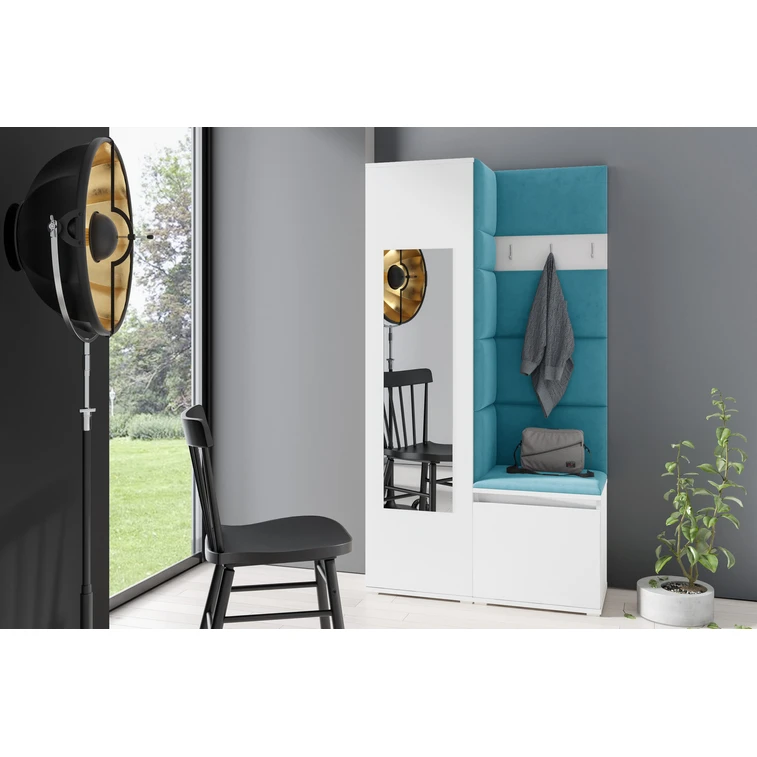 Předsíňová stěna AMI 13, je moderní a praktický prvek do vstupních prostor vašeho domu. Předsíňová stěna obsahuje deset čalouněných panelů, které se montují přímo na stěnu za pomoci lepidla. Potah botníku je tkanina TRINITY, která je měkká a příjemná na dotek. Jedná se o velurovou tkaninu. Předsíňová stěna se skládá z několika částí.